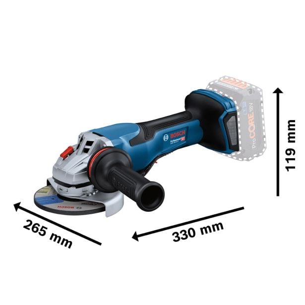 Ta kotni brusilnik je odličen za brušenje kovine in zvarov ter za rezanje kovine, betona, opek in ploščic. Združljiv je z vsemi akumulatorskimi baterijami in polnilniki iz sistema Bosch Professional 18V. Za najboljšo uporabniško izkušnjo priporočamo uporabo baterij ProCORE18V z kapaciteto vsaj 5,5 Ah. Ta kotni brusilnik je združljiv tudi z pokrovoma za odsesavanje GDE 125 EA-T in GDE 115/125 FC-T.