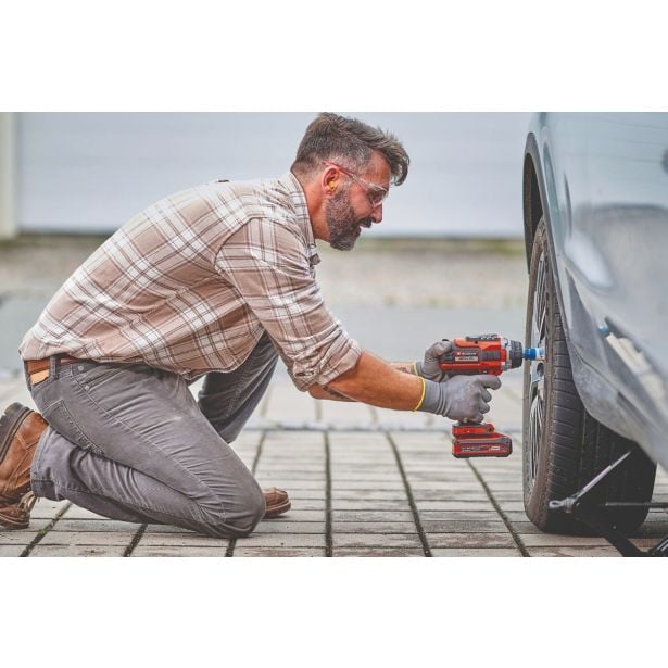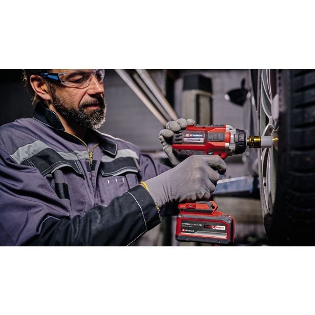 Enostavno sprostite ali zategnite tudi matice avtomobilskih koles zmogljiv akumulatorski udarni vijačnik Einhell IMPAXXO 18/400 ima brezogljični motor, robustno 1/2-palčno kvadratno vpenjalo in hitrost do 2100 vrtljajev na minuto