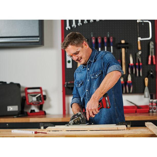 Einhell akumulatorska mini krožna žaga TE-CS 18/89 Li – Solo Power X-Change je lahka in priročna – udobna za uporabo in zato prijetna za delo. Kot član družine Power X-Change lahko katero koli baterijo PXC kombinirate z mini krožno žago. Baterija in polnilnik serije PXC nista vključena v obseg dobave in sta na voljo ločeno. Globino reza je mogoče nastaviti brez orodja. Zahvaljujoč blokadi vretena je tudi menjava žaginega lista izjemno enostavna. List žage iz karbidne trdine in odporna ograja zagotavljata čiste, natančne reze, največja globina reza je 28 mm. Idealna za ravne reze, kose reze lesa, plošče, parket ali plošče iz različnih materialov. Visokokakovostna aluminijasta žagina miza zagotavlja optimalno stabilnost. Za čisto delovno mesto poskrbi adapter za sesalnik na ohišju.