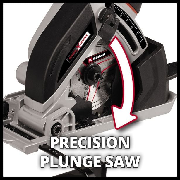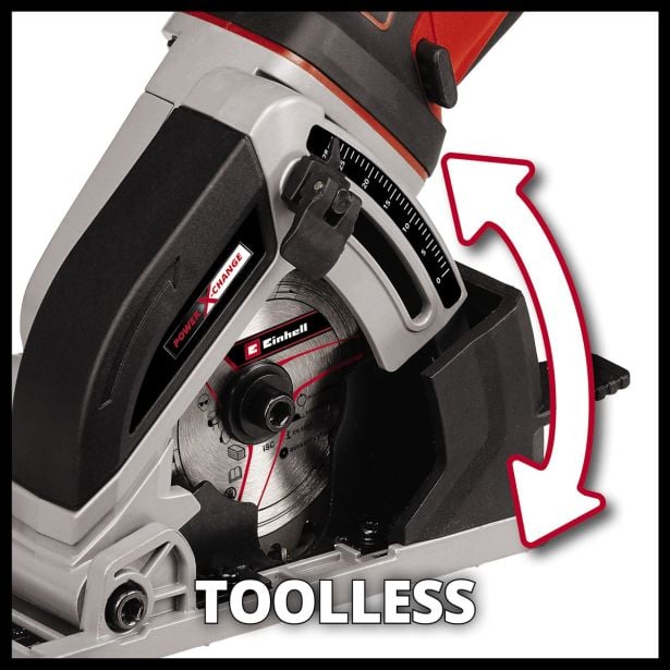 Einhell akumulatorska mini krožna žaga TE-CS 18/89 Li – Solo Power X-Change (litijevi ioni, nastavitev globine reza brez orodja, globina reza 28 mm, kakovostna žagina miza, list fi 89 mm, brez baterije in polnilnika).