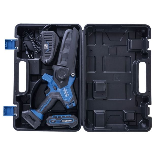 Kompakten in lahek akumulatorski rezalnik za obrezovanje dreves, grmovnic.Motor brez krtačk, ki ne zahteva vzdrževanja, s posebno visoko učinkovitostjo, daljšim časom delovanja, dolgo življenjsko dobo in nizko obrabo. V kompletu z baterijo in polnilnikom, v kovčku.