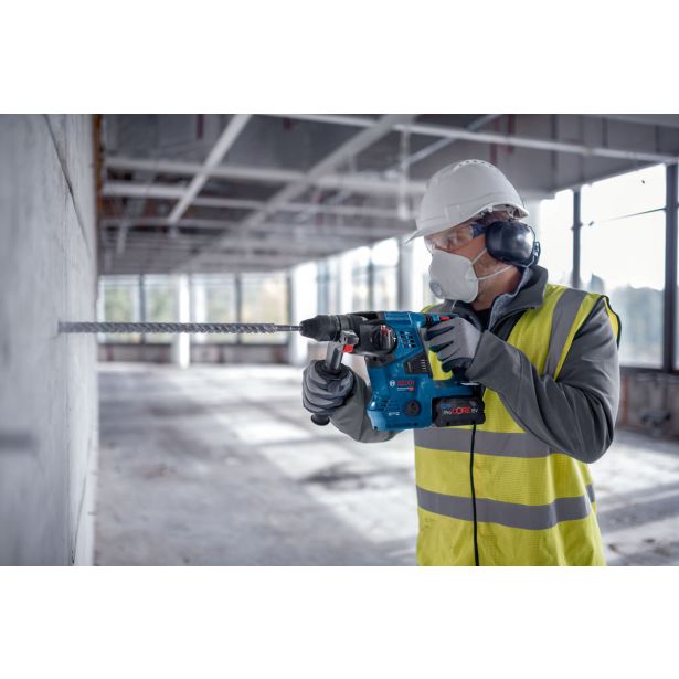 To vrtalno kladivo je popolna izbira za udarno vrtanje v beton, kamen ali zid. Združljivo je z vsemi akumulatorskimi baterijami in polnilniki iz Boschevega profesionalnega 18-V akumulatorskega sistema. Za varnejše delo brez prahu priporočamo uporabo nastavka za odsesavanje GDE 18V-16 skupaj s sesalnikom. Orodje je opremljeno tudi s kljuko za obešanje in LED-lučko.