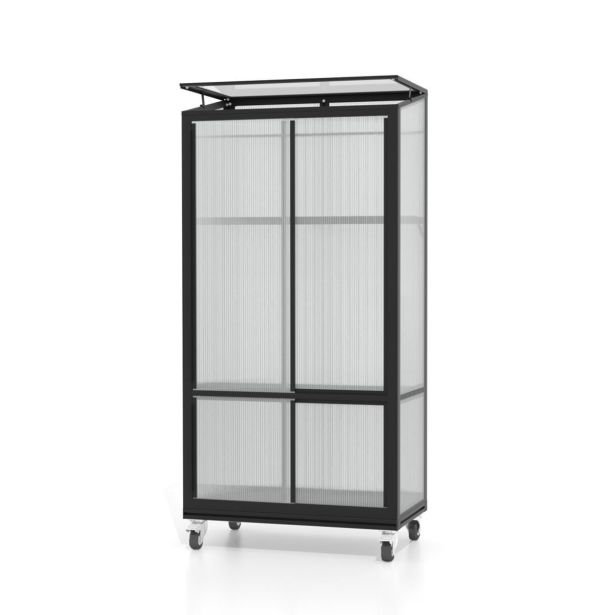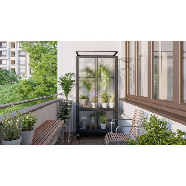 Balkonski rastlinjak s koleščki Polis 350, tlemi in policami je ravno pravšen, da ga lahko upmestite tudi na vaš balkon, saj zavzame le 0,35 m2 prostora.