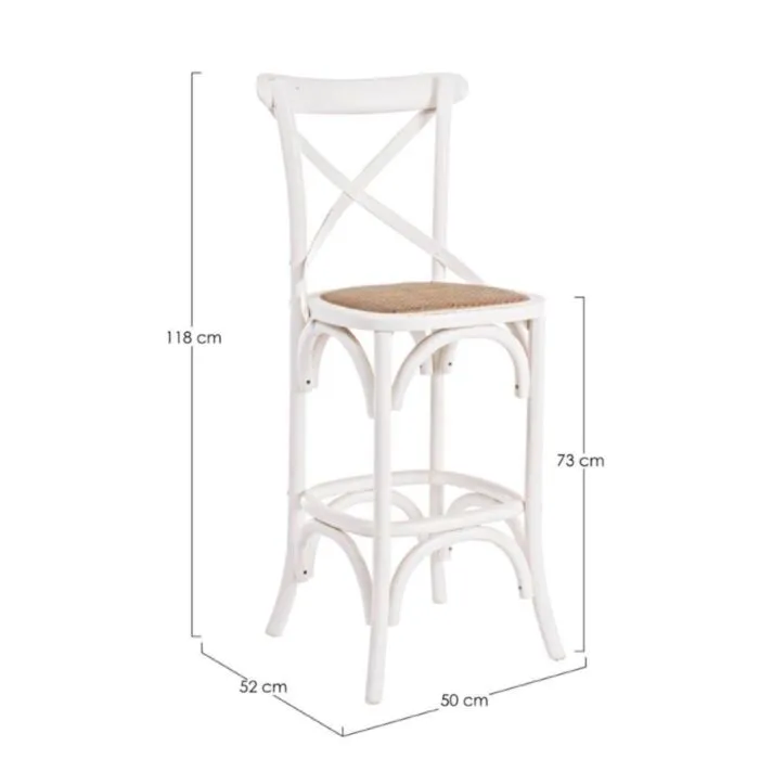Barski stol CROSS – bela, je eleganten stol, ki popestri vaš prostor ali okolico. Primeren je tako za jedilnice, kmečke turizme ali opremo gostinskih lokalov. Narejen je iz brestovega lesa, ima podloženo sedišče, kar zagotavlja prijetno sedenje. Oblečen je v naravni ratan.