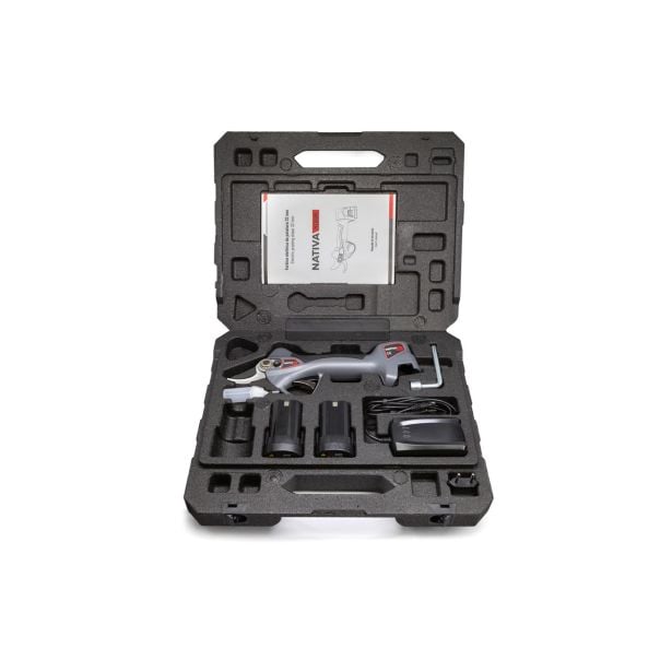 Baterijske škarje Ausonia Nativa Medium – do 32mm, s priloženima polnilnima baterijam in ostalimi dodatki v praktičnem kovčku.