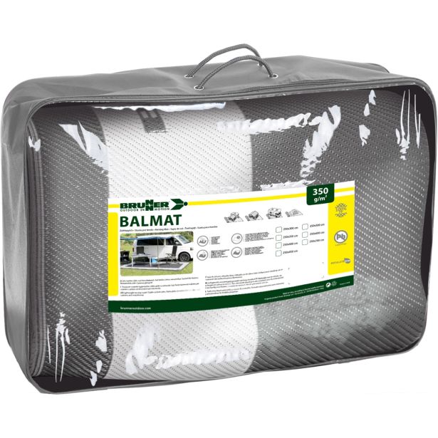 Zelo lahka preproga za šotor in tendo, izdelana iz 100% visokokakovostnega polipropilena, primerna predvsem za manjše avtodome ali počitniške prikolice. Je enostaven za transport ter hiter in priročen za čiščenje. Posebna zračna struktura omogoča dihanje rastlinja pod njem. Obojestransko uporabna Balmat Premium je opremljena z ušesci na 4 robovih, da jo je mogoče pritrditi na podlago s klini. Priročna transportna torba je vključena v dobavo.