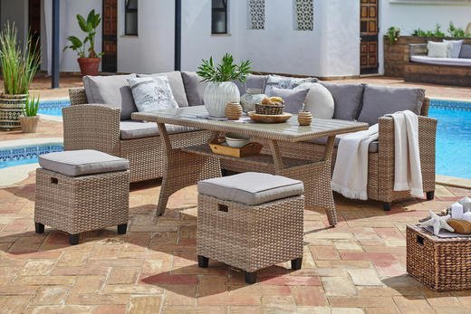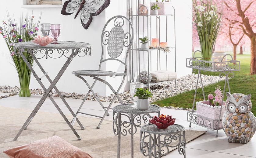 Pri opremi balkona glavno vlogo vsekakor igra udobna vrtna garnitura. Sodobni modeli so izdelani iz tehnološko dovršenih materialov, ki odlično kljubujejo obrabi ter vremenskim razmeram. Modni so elementi izčiščenih in futuristično zaobljenih linij, med materiali pa prevladujejo kovine in tkanine iz umetnih vlaken. Večno modni so tudi modeli iz kovane kovine starinskih linij, ki spominjajo na romantične angleške vrtove.