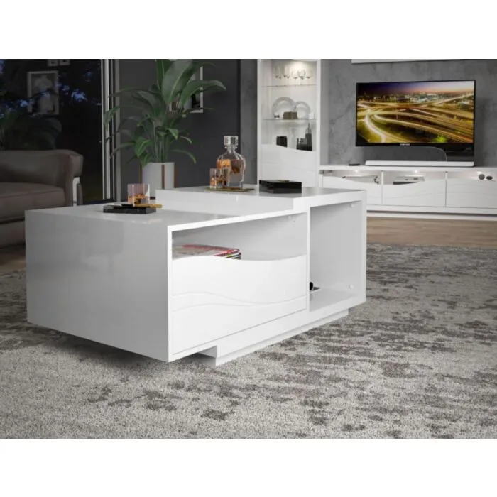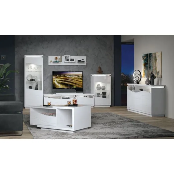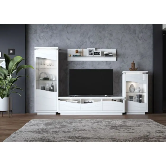 Dnevna soba BALET bela je elegantna dopolnitev vašega dnevnega prostora, ki navdušuje s sodobnim pristopom k dnevni ureditvi. Poseben pečat daje kompletu valovita