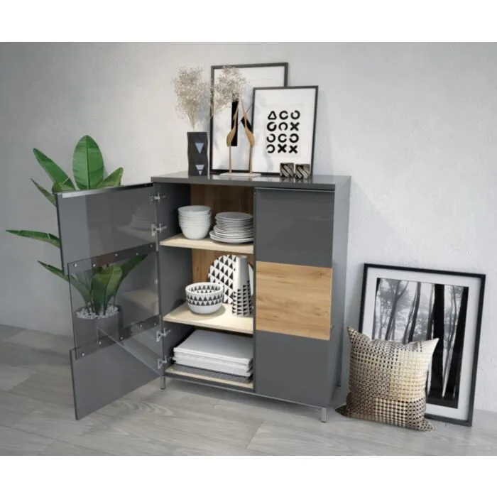 – MDF sprednje in stranske plošče (deb. 25 mm) / iveral (deb. 18 mm) / PVC ročaji / UV lak / kromirane nogice / mehko zapiranje
