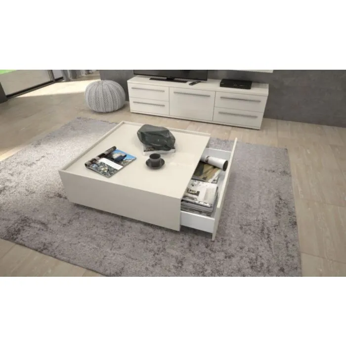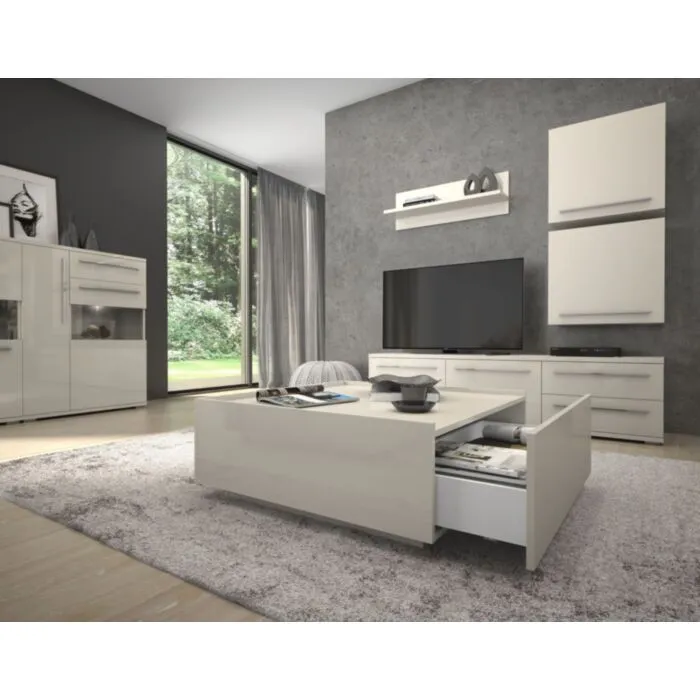 Dnevna soba KAVAL 1 je minimalistična in sodobna. Visoki sijaj krem barve bo vaš prostor še dodatno povečal in napolnil s svetlobo. Komplet ima mehko zapiranje in LED osvetlitev.
