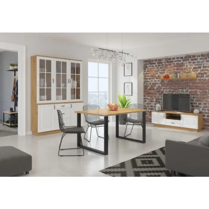 Dnevni regal FAJA 4 je sestavljen iz sodobnega pohištva v beli in hrast barvi.  Sestavljen je iz velike vitrine, police in TV regala.