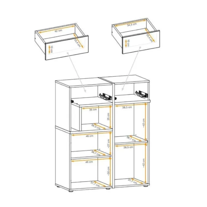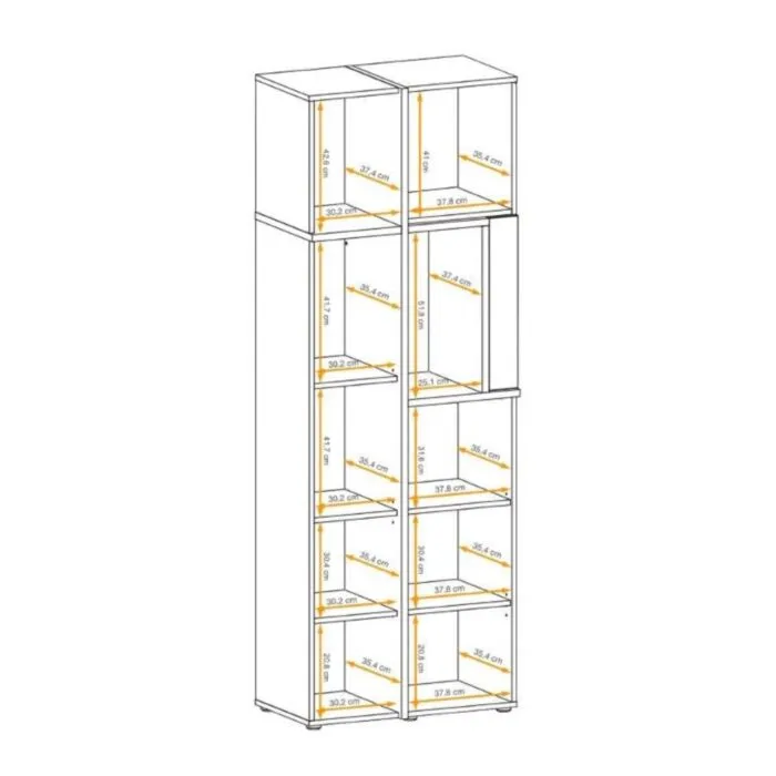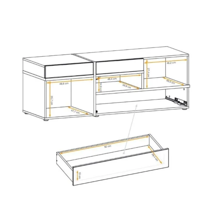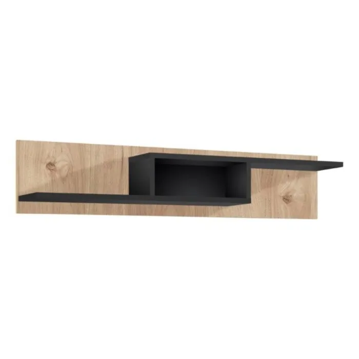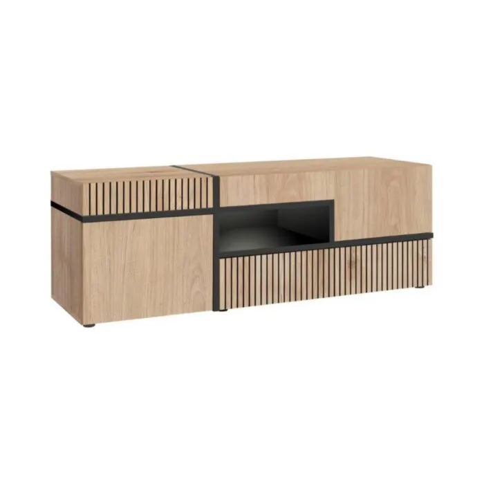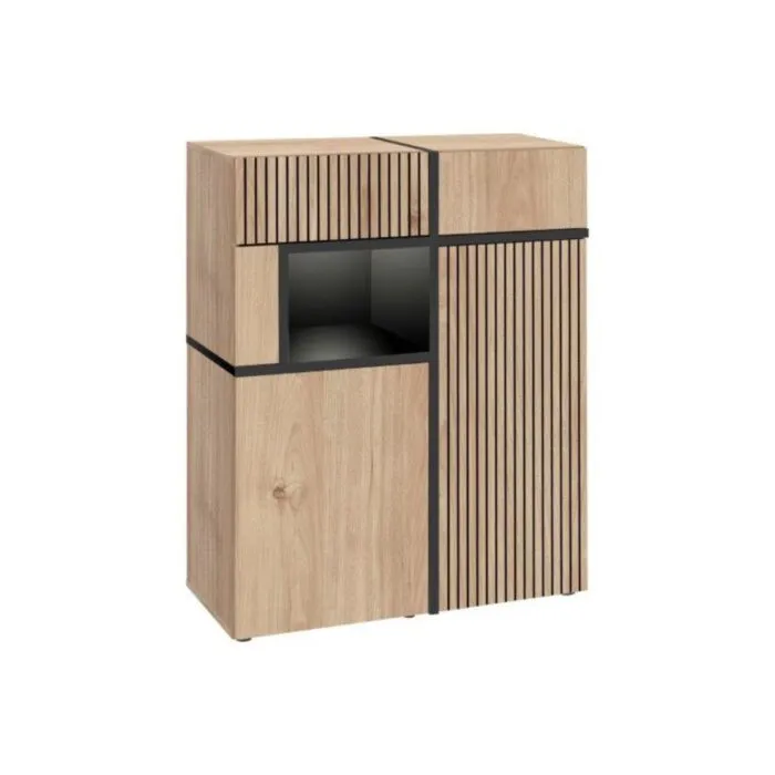 Dnevni regal FERI je eleganten in atraktiven. Moderen dizajn, z dodatkom kombinacije črne mat barve ter tiska črnih črt, se bo podal v vsak prostor. Visoka omara vsebuje v notranjosti odprte poličke LED osvetlitev. Dnevni regal vsebuje 1x visoko omaro, 1x komodo, 1x tv omarico ter 1x polico.