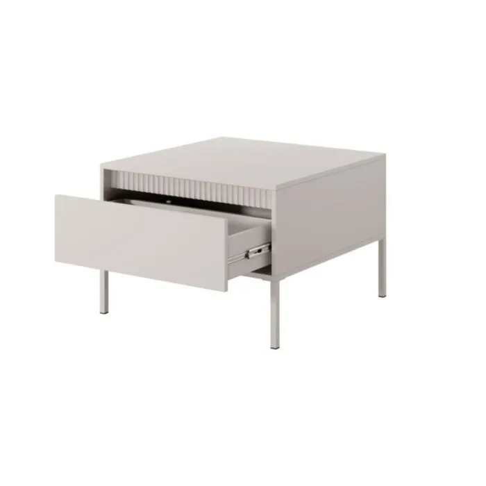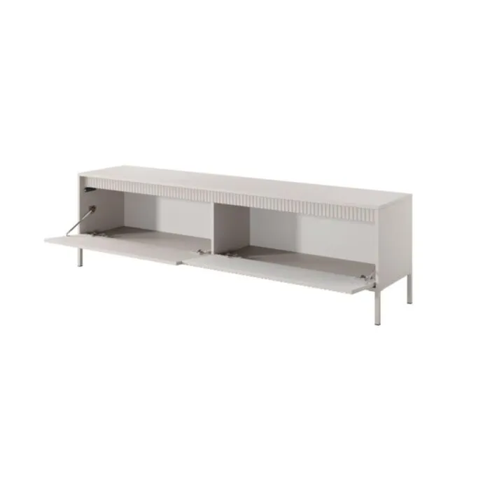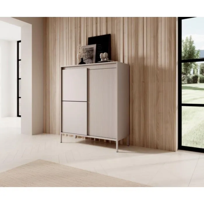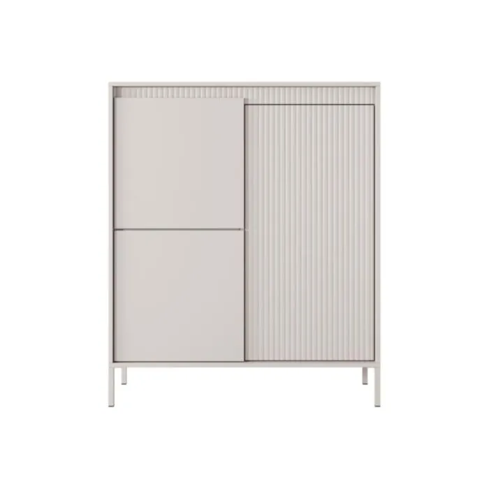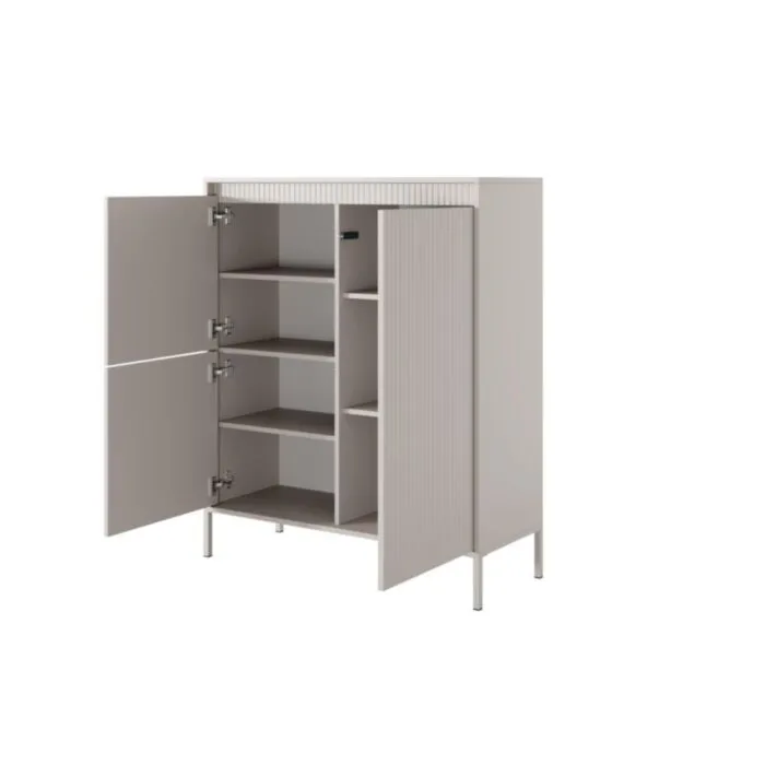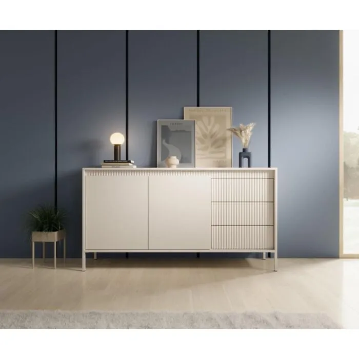 Dnevni regal FIFIJA – bež, je eleganten kos pohištva, ki popestri vaš prostor s svojim luksuznim dizajnom. Narejen je iz kakovostnih materialov v bež barvi. Izdelan je iz MDF-ja in ABS robov. Ima kovinske nogice v bež barvi in mehko zapiranje. Ima poseben rebrasti dizajn, ki popestri vaš prostor.