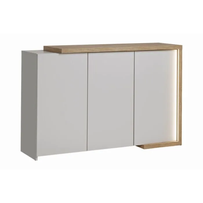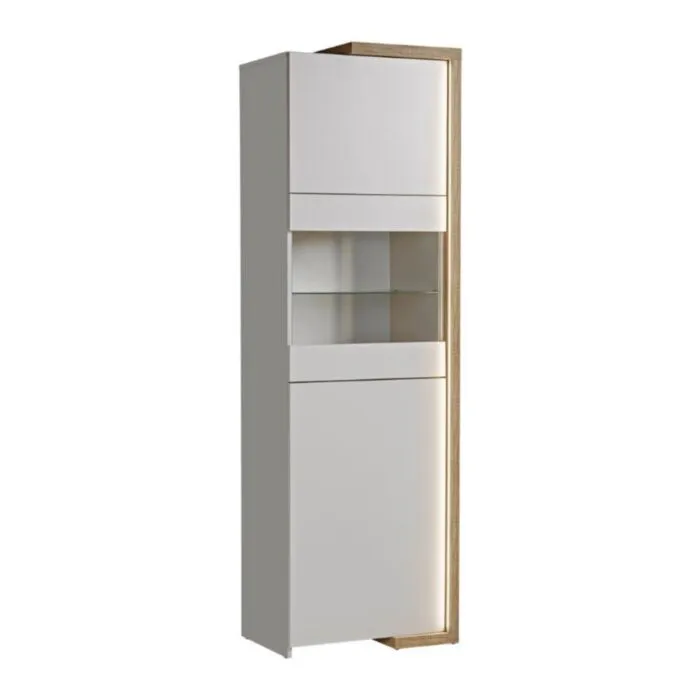 Elementi imajo ob straneh pri lesenem delu LED osvetlitev, ki je vključena v ceno. Vitrini sta iz kaljenega stekla debeline 4mm. Izdelan v EU iz laminirane plošče, kašmir debeline 16mm leseni del pa 28mm in ABS robovi.
