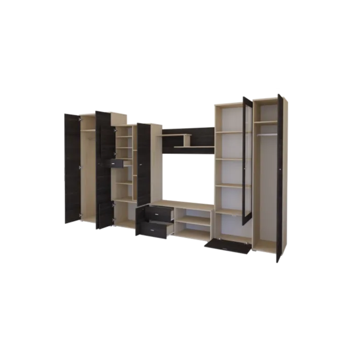 Dnevni regal LEONIDA je zelo eleganten in stabilen. Primeren je za vsako dnevno sobo. Korpus regala ja v barvi svetlega hrasta, fronta regala pa je v barvi temnega hrasta. Noge regala so plastične. Narejen je iz laminirane plošče debeline 16 mm z ABS robovi.