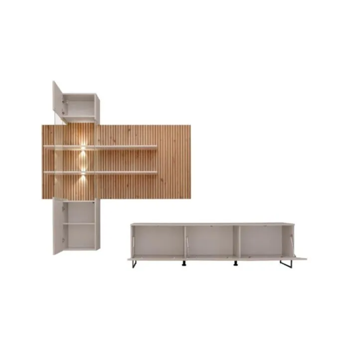 Dnevni regal LUXUR 1 je modernega dizajna. Kombinacija preprostega in privlačnega dizajna se bo podal v vsak prostor. Regal ima v vitrini dodatno osvetlitev, katera bo polepšala vsak prostor. Narejen je iz kvalitetne iverne plošče. Plošča v barvi artisana ima detajle črnih tiskanih črt.