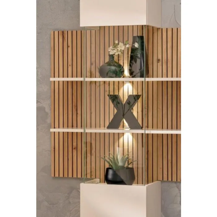 Dnevni regal LUXUR 2 je modernega dizajna. Kombinacija preprostega in privlačnega dizajna se bo podal v vsak prostor. Regal ima v vitrini dodatno osvetlitev, katera bo polepšala vsak prostor. Narejen je iz kvalitetne iverne plošče. Plošča v barvi artisana ima detajle črnih tiskanih črt.