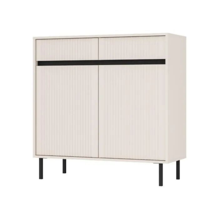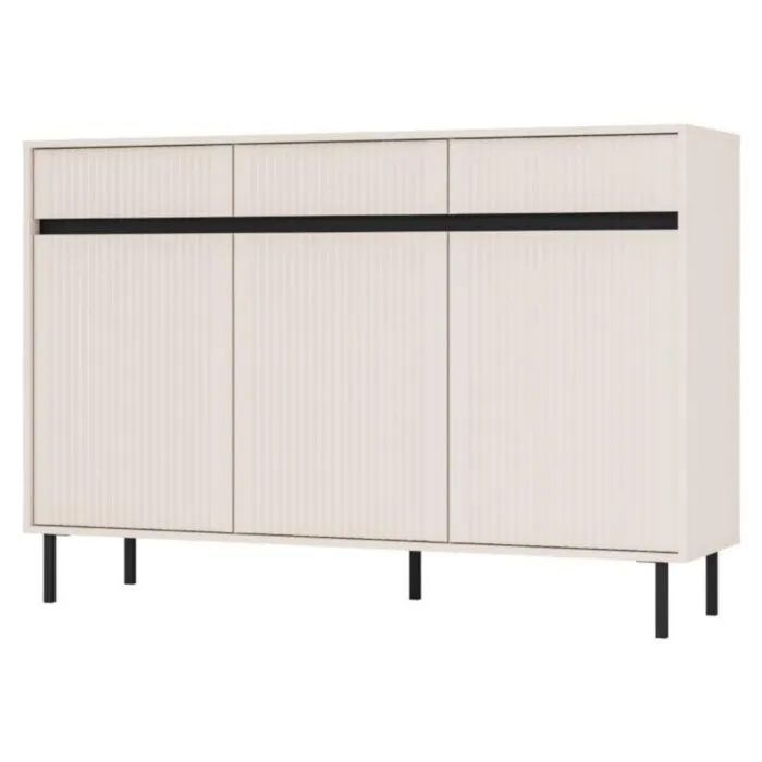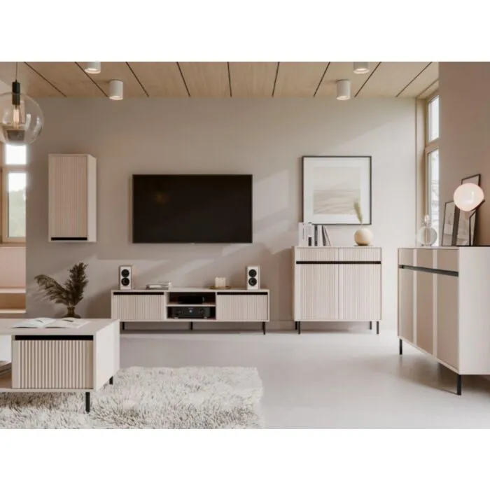 Robovi so obdelani z ABS materialom, kar povečuje odpornost na obrabo in podaljšuje življenjsko dobo pohištva. Fronte so iz MDF plošč debeline 16 mm in prav tako v bež barvi, kar dodaja eleganco in sodoben pridih. Dnevni regal se ponaša z elegantnimi nogicami v črni metal barvi, katerih višina znaša 15 cm.