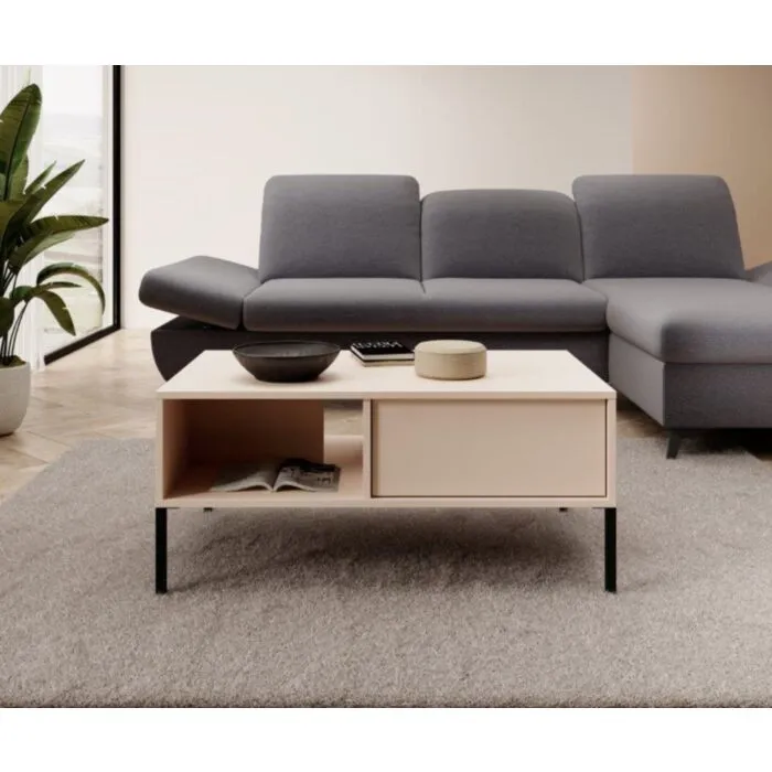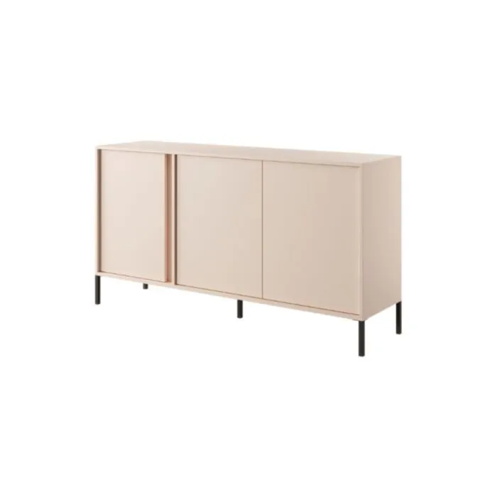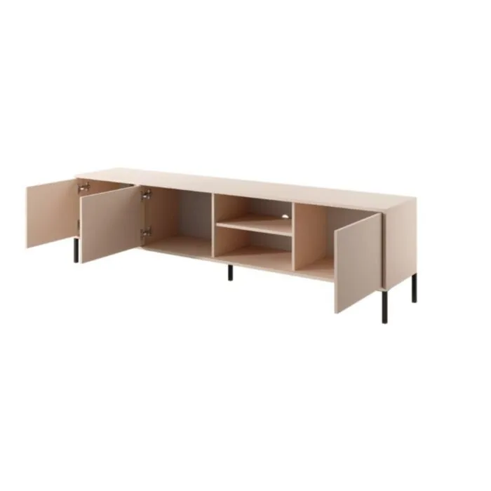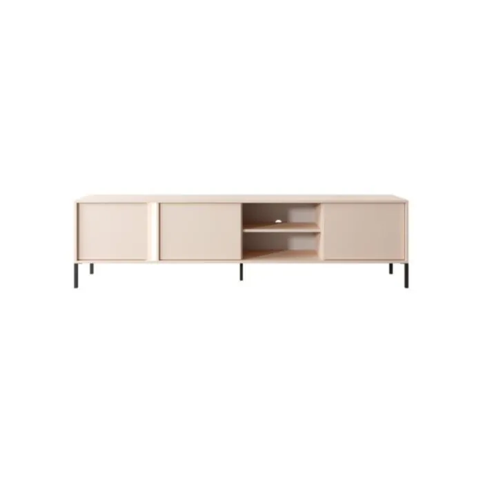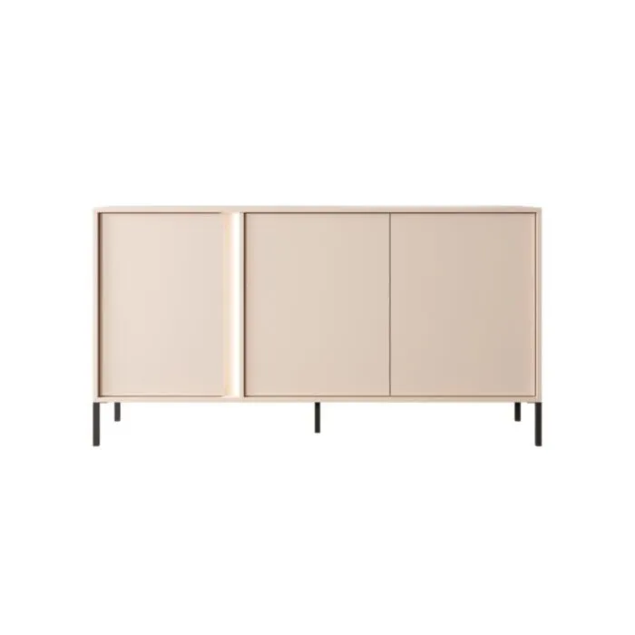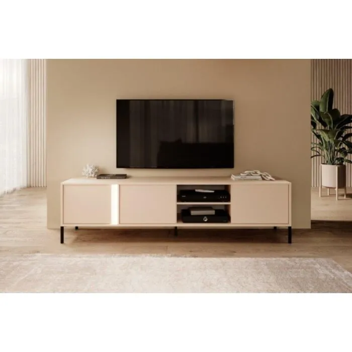 Dnevni regal MIR 2 odlikuje lahkotnost in eleganca. To je posledica oblike in zanimive, navpične LED osvetliteve v vdolbinah, ki se popolnoma ujema z nežno bež barvo in izniči močen efekt črnih kovinskih nogic. Ta kombinacija bo popestrila vsako dnevno sobo in jo optično povečala.