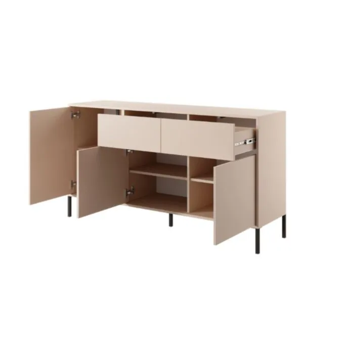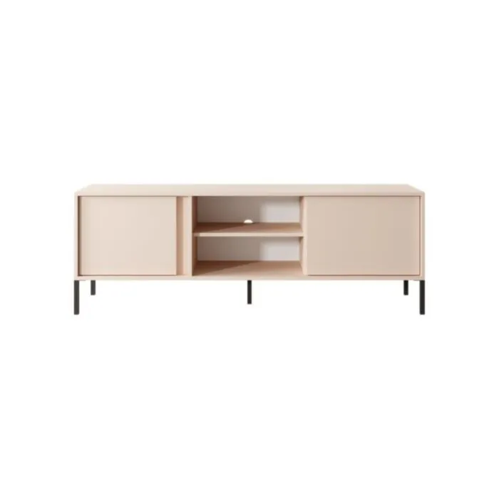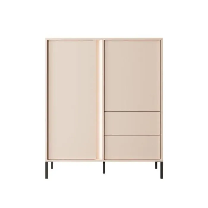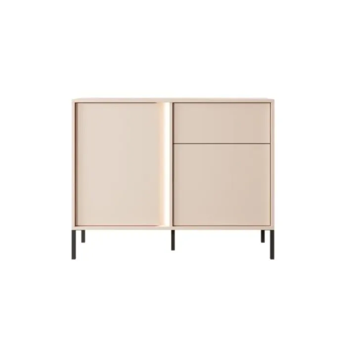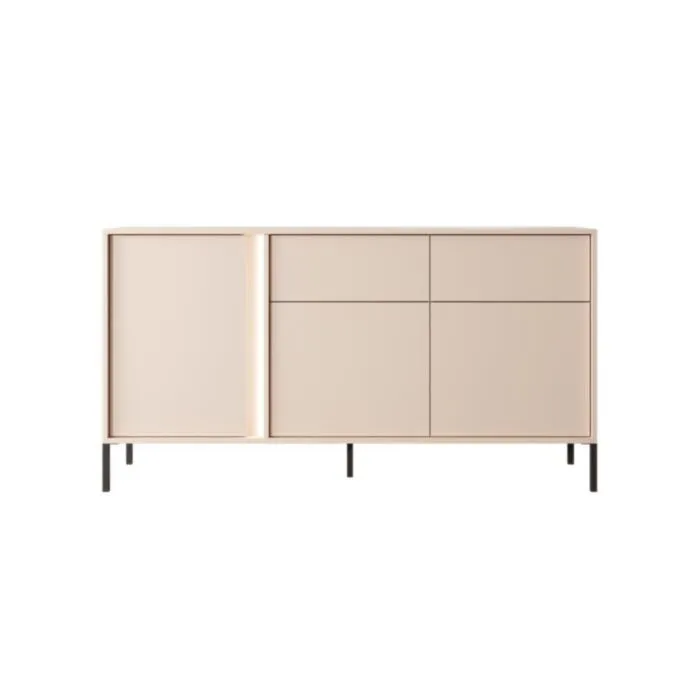 Dnevni regal MIR odlikuje lahkotnost in eleganca. To je posledica oblike in zanimive, navpične LED osvetliteve v vdolbinah, ki se popolnoma ujema z nežno bež barvo in izniči močen efekt črnih kovinskih nogic. Ta kombinacija bo popestrila vsako dnevno sobo in jo optično povečala.