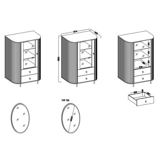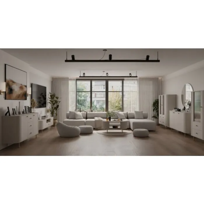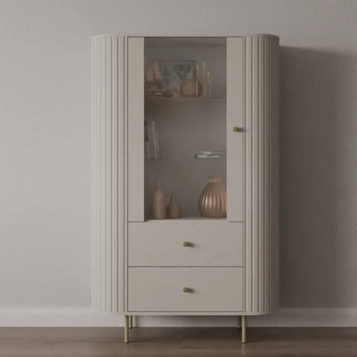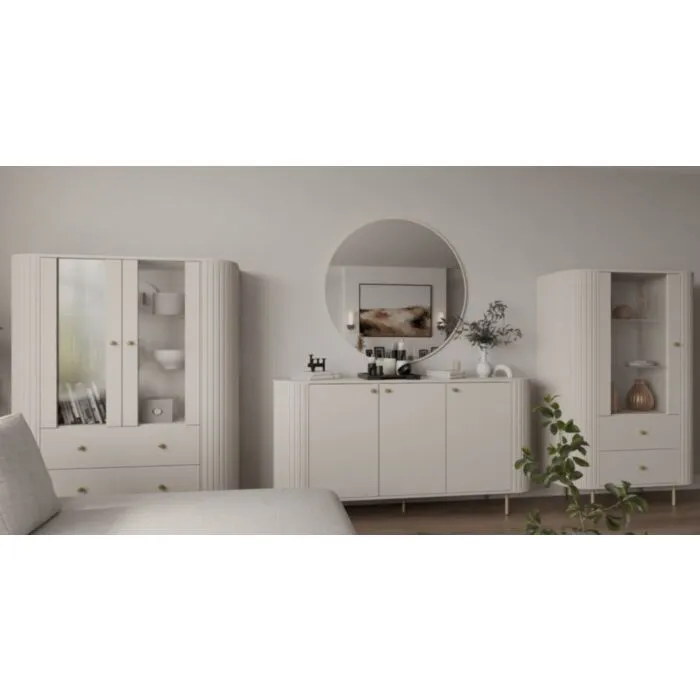 Dnevni regal OVARI bež je eleganten in funkcionalen kos pohištva. Dnevni regal vsebuje kar pet elementov pohištva, ki odlično dopolnijo prostor. Sestavljen je iz dveh prostornih komod, TV omarice, klubska mizice in elegantne vitrine. S svojo ovalno obliko se odlično poda v vsak prostor. Narejen je iz laminirane plošče debeline 16 mm v kombinaciji MDF-ja debeline 16 mm.