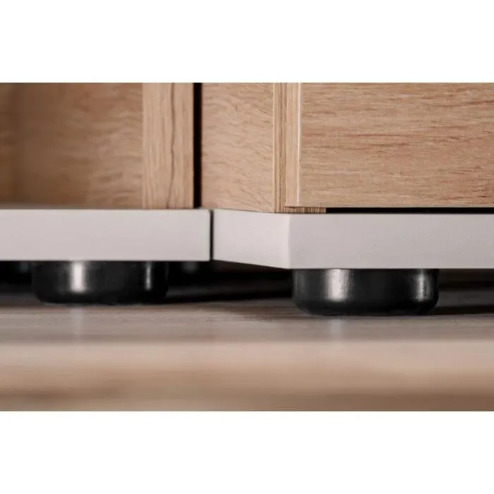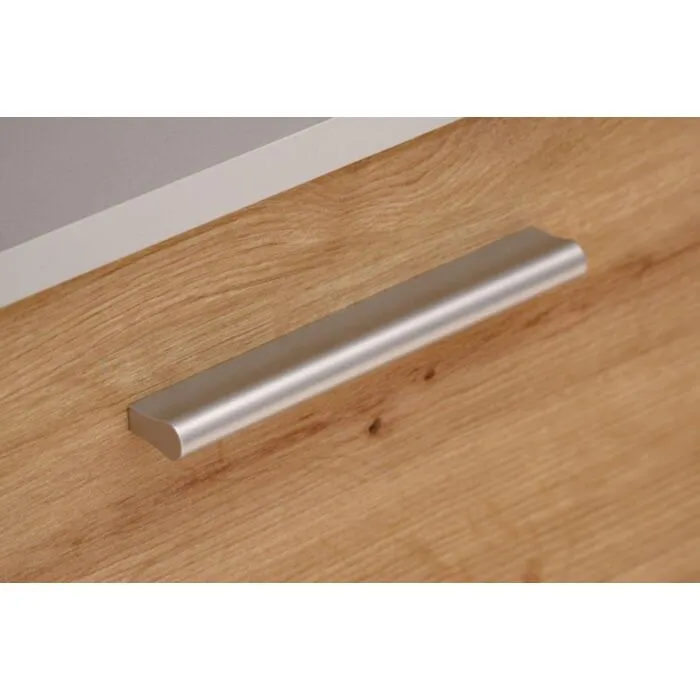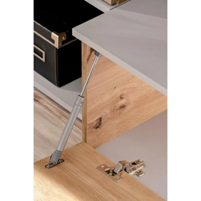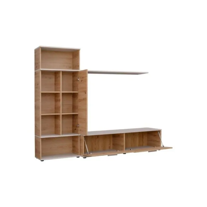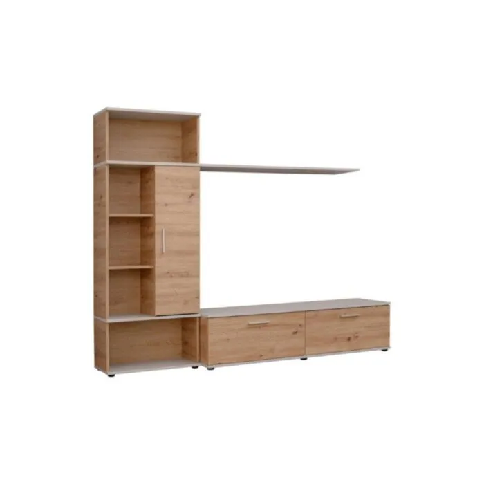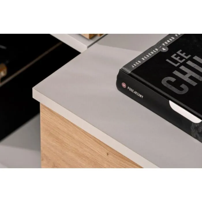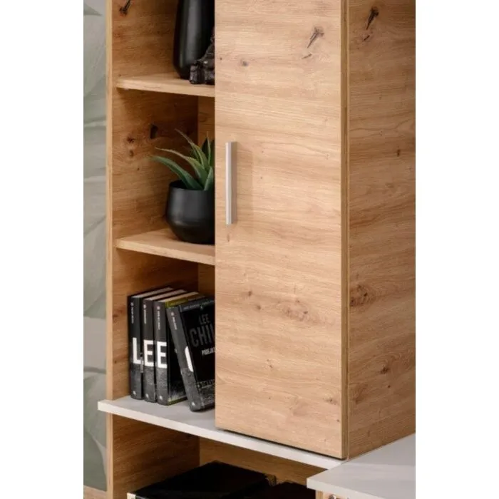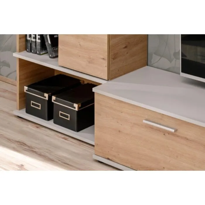 Dnevni regal ROLI je modernega dizajna. Kombinacija hrasta in svetlo sive barve se bo podala v vsak prostor. Narejen je iz kvalitetne iverne plošče. Ročke so srebrne barve.
