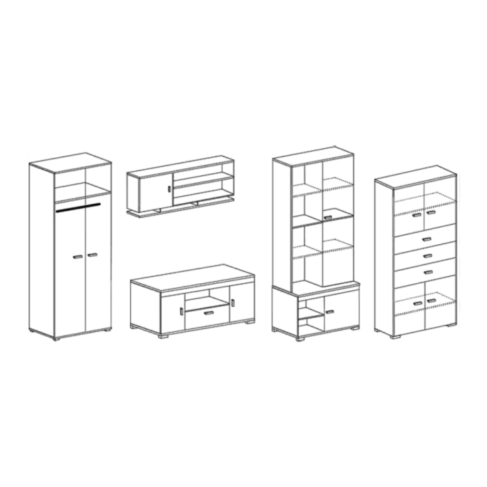 Dnevni regal RUBY je eleganten in zelo stabilen. Primeren je za vsako dnevno sobo. Korpus regala je v barvi svetlega hrasta, fronte nekaterih omaric pa so v barvi temnega hrasta. Narejen je iz laminirane plošče debeline 16 mm z ABS robovi. Noge in ročaji regala so plastični. Dimenzija dnevnega regala je 350cm.