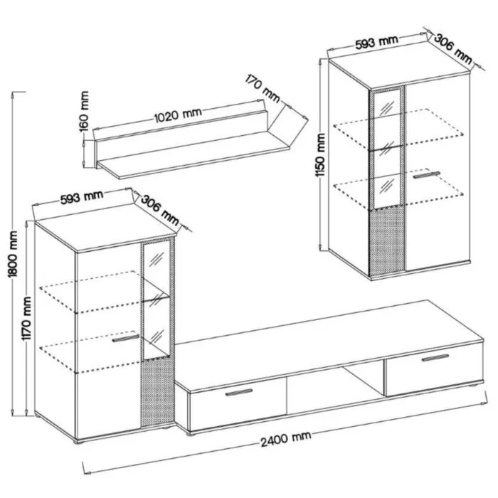 – Viseča vitrina: Š: 59,3 cm x V: 115 cm x G: 30,6 cm