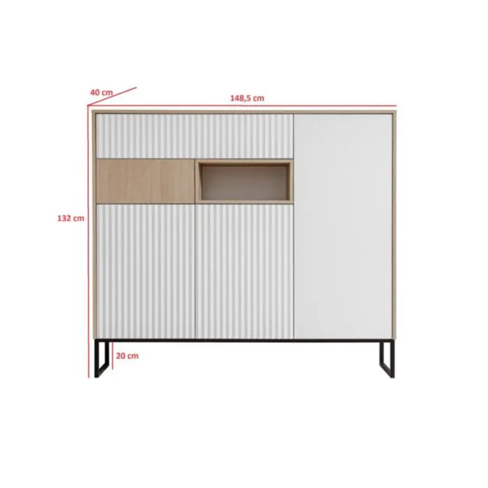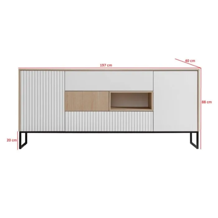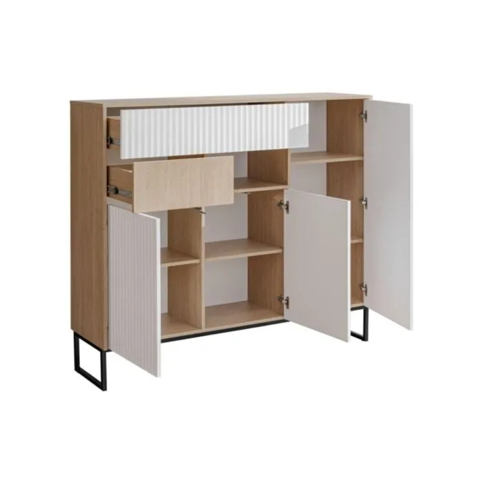 Dnevni regal ZOELA je moderno oblikovan in elegantnega videza. Brez ročajev, odpiranje po sistemu push to open. V beli mat barvi s kombinacijo lesa. Izdelan v EU iz laminirane plošče debeline 16mm in ABS robovi. Nogice ima metalne črne barve.