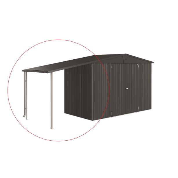Stranski nadstrešek za vrtno hiško Evropa lahko pritrdite na levo, desno ali na obe strani hiške. Komplet vsebuje vse priključne dele, žleb za deževnico in podpornike, potrebne za namestitev (ni na voljo za velikosti 1 in 2A).