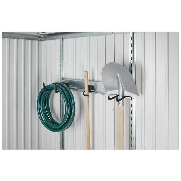 Set sestavljajo kombinirani kavelj, palični kavelj in lopatasti kavelj ter stenski regal, ki se vpne med 2 podporni tirnici*.