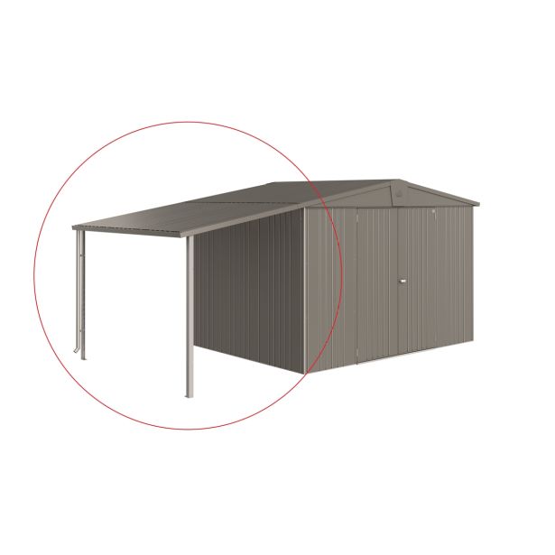 Stranski nadstrešek za vrtno hiško Evropa lahko pritrdite na levo, desno ali na obe strani hiške. Komplet vsebuje vse priključne dele, žleb za deževnico in podpornike, potrebne za namestitev (ni na voljo za velikosti 1 in 2A).