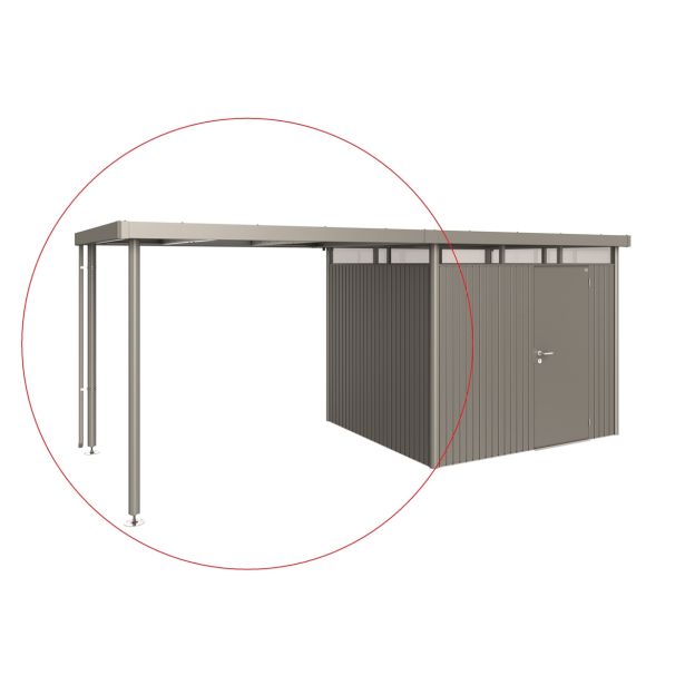 Stranski nadstrešek lahko pritrdite na vrtno hiško HighLine (od velikosti H2 naprej) na stran z žlebom – na eni ali obeh straneh – ne glede na to, katera možnost najbolje ustreza vašim zahtevam. To ustvarja pokrit odprt prostor enak enojni / dvojni površini vrtne hiške. Aluminijaste opore so opremljene z nastavljivo višino. Vključena je cev za deževnico.