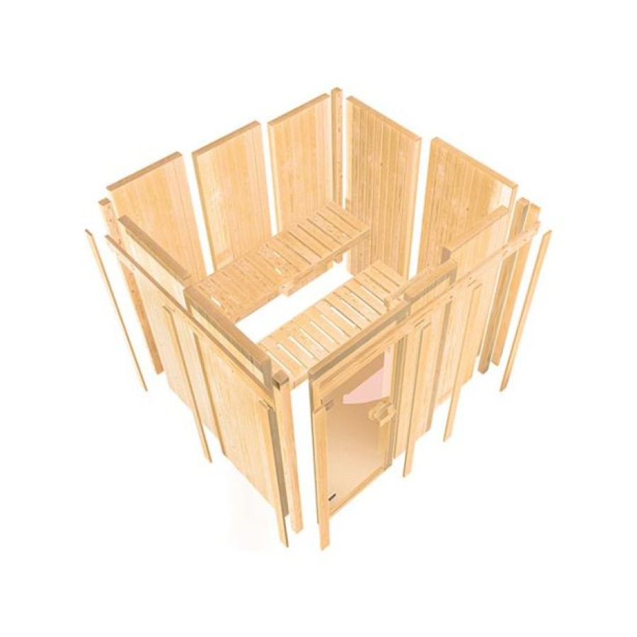 Karibu notranja savna Askja je sestavljena iz 68 mm debelih, izoliranih stenskih elementov in izolirane strehe savne. Vidne stranice so izdelane iz počasi rastoče nordijske smreke. Bronasta popolnoma steklena vrata so sestavljena iz 8 mm debelega varnostnega stekla, uokvirjenega v masiven lesen okvir. Tečaji vrat so enostavno nastavljivi z ekscentri. Zahvaljujoč preizkušeni tehnologiji magnetnega zaklepanja se vrata zlahka odpirajo in zapirajo. LED točke v okrasnem strešnem obroču kopajo savno v prijetni svetlobi in tako prispevajo k popolni sprostitvi.