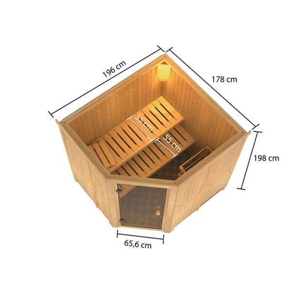 – 1 x Karibu notranja savna Bodo + 9kW grelec za savno + zunanji nadzor – 68mm element savna – kotna savna