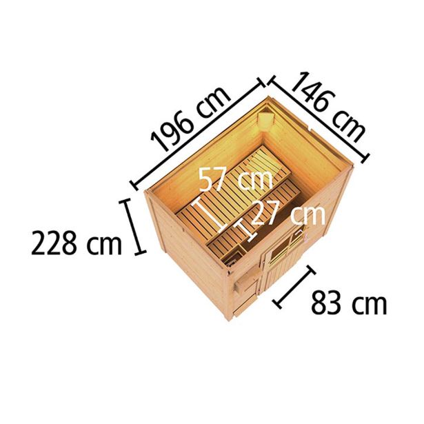 Kompaktna vrtna savna Hytti 1 podjetja Karibu je idealna rešitev za manjše vrtove, saj zaseda le 2,4 m2 površine. Savna je zasnovana za udobno namestitev 1-2 oseb, opremljena z dvema ležalnikoma dimenzij 184 x 57 cm in 184 x 27 cm. Energijsko varčna vrata s prozornim steklom zagotavljajo optimalno zadrževanje toplote, medtem ko robustna konstrukcija iz 38 mm debel lesa omogoča enostavno sestavljanje in dobro izolacijo.