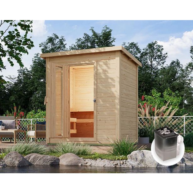 Kompaktna vrtna savna Hytti 1 podjetja Karibu je idealna rešitev za manjše vrtove, saj zaseda le 2,4 m2 površine. Opremljena je z dvema ležalnikoma, kar omogoča udobno savnanje za 1-2 osebi. Energijsko varčna vrata s prozornim steklom zagotavljajo optimalno zadrževanje toplote, medtem ko robustna konstrukcija iz 38 mm debel nudi stabilnost in dobro izolacijo.