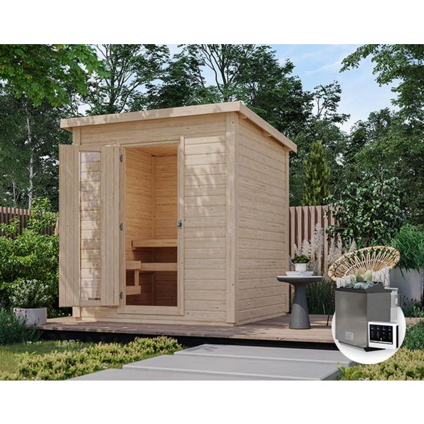Kompaktna vrtna savna Hytti 2 podjetja Karibu je idealna rešitev za manjše vrtove, saj se zlahka prilega tudi v omejen prostor. S površino 3,3 m2 in dvema ležalnikoma, ki merita 184 x 57 cm, nudi udobje za 2-4 osebe. Energijsko varčna vrata s prozornim steklom ohranjajo toploto, medtem ko robustna konstrukcija iz 38 mm debel zagotavlja enostavno sestavljanje in odlično izolacijo. Optimalne temperature med 75°C in 100°C omogočajo prijetno savnanje, stabilen pod iz masivnega lesa pa nudi dodatno zaščito pred vlago.
