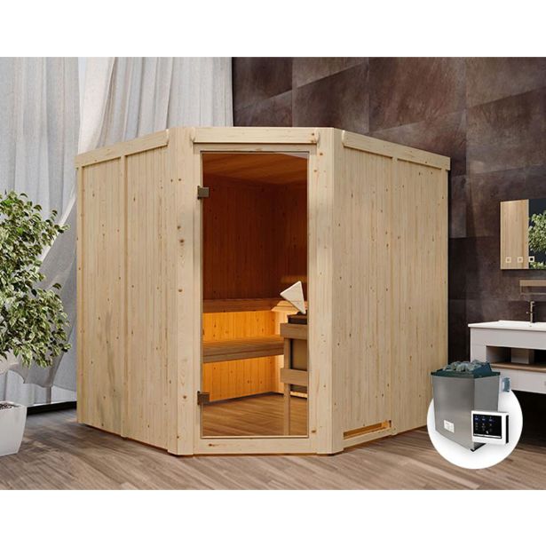 68 mm sistemska savna Jarin proizvajalca Karibu z kotnim vstopom je odlična za 2-4 osebe . Na treh velikih klopeh za savno s površino 57 ali 52 x 181 cm se lahko udobno sprostite v paru ali manjši skupini.