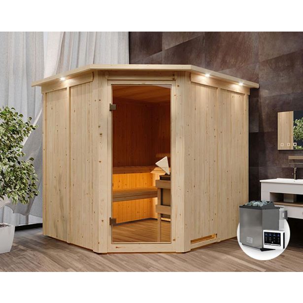 68 mm sistemska savna Jarin proizvajalca Karibu z kotnim vstopom je odlična za 2-4 osebe . Na treh velikih klopeh za savno s površino 57 ali 52 x 181 cm se lahko udobno sprostite v paru ali manjši skupini.