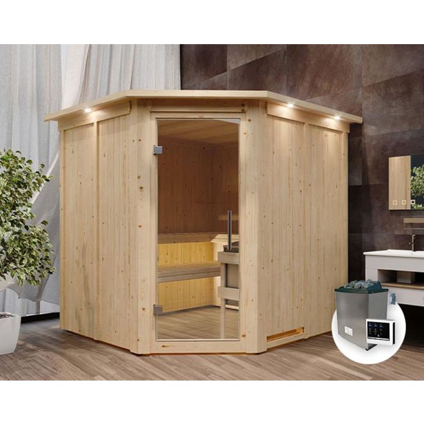 68 mm sistemska savna Jarin proizvajalca Karibu z kotnim vstopom je odlična za 2-4 osebe . Na treh velikih klopeh za savno s površino 57 ali 52 x 181 cm se lahko udobno sprostite v paru ali manjši skupini.