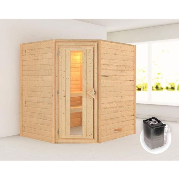 Savna na drva Karibu Mia vklj. pečjo 9 kW in integrirano regulacijo brez strešnega roba z lesenimi vrati in izolacijskim steklom, toplotno izolirana