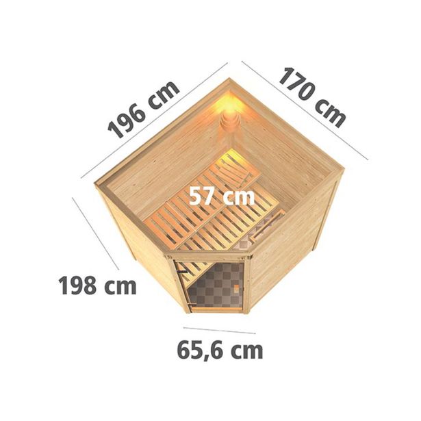 Savna iz masivnega lesa, izdelana iz 38 mm debelih masivnih lesenih plošč iz visokokakovostne nordijske smreke, je zgrajena po preprostem sistemu vtič/vijak. Kakovostna vrata savne z kotnim vhodom vas po montaži popeljejo v notranjost dimenzij 185 cm x 159 cm. Tukaj prejmete priloženo zaščitno rešetko za pečico in 2 ležalnika. Tudi pri naših masivnih savnah v sistemu vtič/vijak so vse 4 stranske stene iz masivnega smrekovega lesa, zato ne uporabljamo lesonita ali podobnega (razen v predelu strehe). Savno s 4 vidnimi stranicami lahko postavite kjerkoli v prostoru. Strešni paneli so sestavljeni iz 57 mm elementne konstrukcije z izolacijo iz mineralne volne.