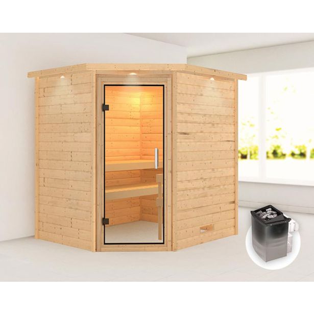 Savna Karibu Mia s pečjo 9 kW in integriranim krmiljenjem s strešnim robom in popolnoma steklenimi vrati iz prozornega stekla