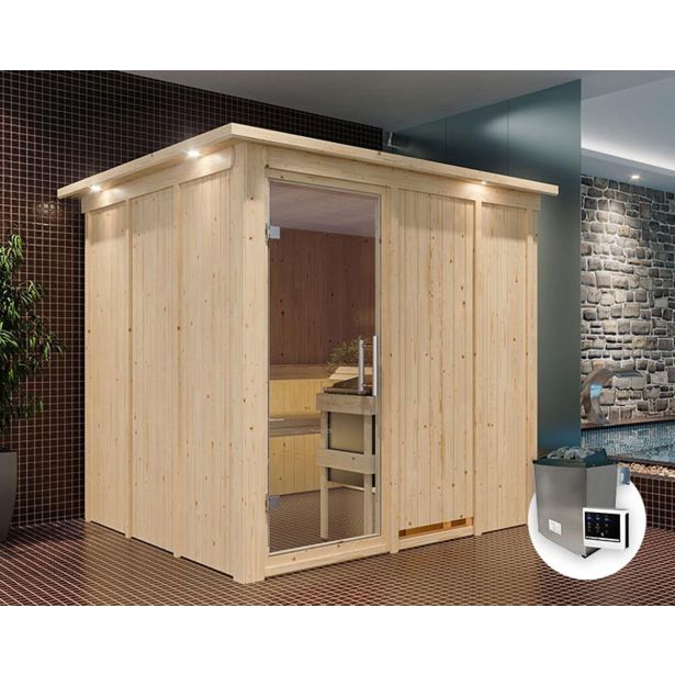 68 mm sistemska savna Rodin proizvajalca Karibu s sprednjim vstopom je odlična za 2-4 osebe. Na treh velikih klopeh za savno s površino 57 ali 52 x 181 cm se lahko udobno sprostite v paru ali manjši skupini.