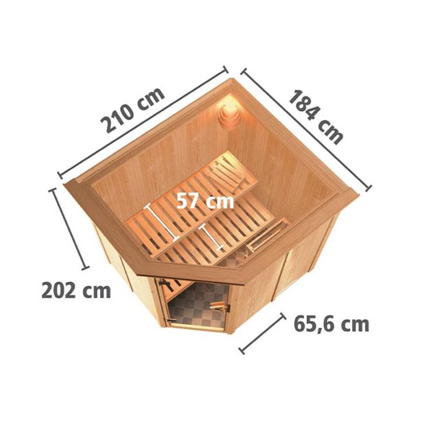 68 mm sistem savne Siirin nudi udoben vstop v savno s svojim prostornim kotnim vstopom . Z notranjo dimenzijo 181 x 155 cm je ena izmed najbolj priljubljenih velikosti med ljubitelji savnanja.
