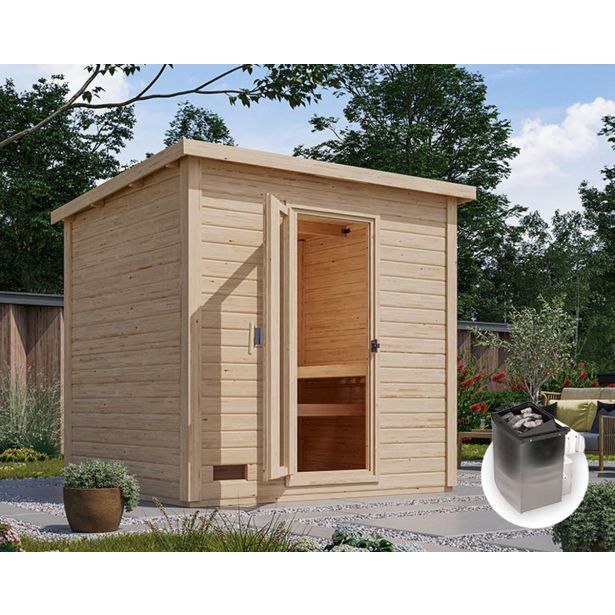 Karibu vrtna savna Hytti je idealna izbira za sprostitev. Opremljena je z 9kW grelcem in integriranim krmiljenjem. Njena 38mm debela konstrukcija zagotavlja energijsko varčnost in naravno udobje.