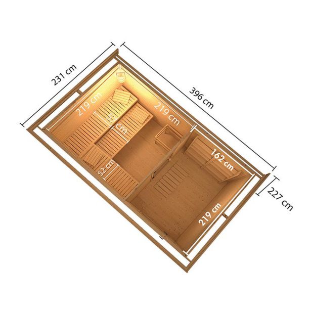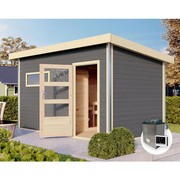 Vrtna savna Karibu Skrollan 3 je opremljena s predsobo in 9kW grelcem. Ima 38 mm debelo konstrukcijo, enoslojno streho ter moderna vrata v terra grey barvi. Idealna za sprostitev.