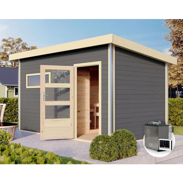 Vrtna savna Karibu Skrollan 3 je moderna savna s predsobo in biokonvektomatom 9 kW. Ima 38 mm debela stena, enokapno streho ter elegantna vrata v terra sivi barvi.