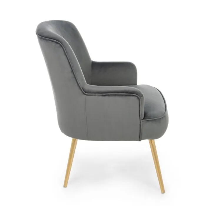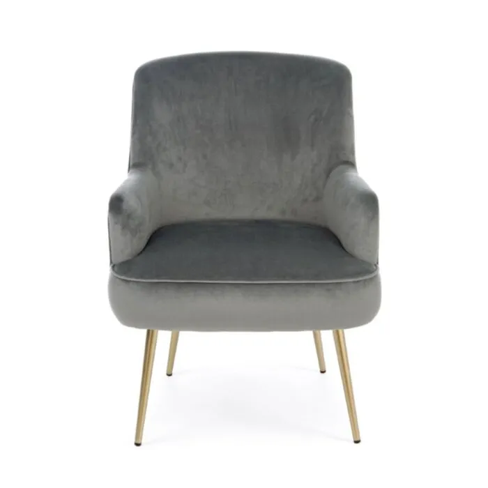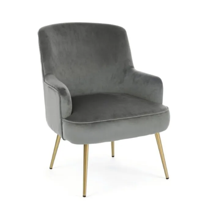 Fotelj CLELIA siva ima strukturo iz borovega lesa, noge so v zlati barvi. Narejen je iz žametne tkanine, ki je prijetena na dotik. S svojo barvo in obliko se poda v vsak prostor ne glede na to ali je to gostinski ambient, pisarna ali pa vaša kuhinja.